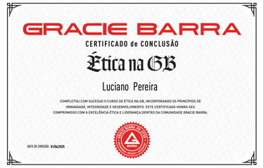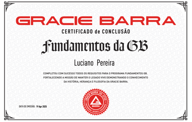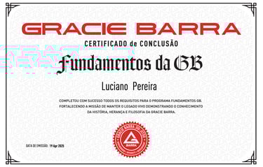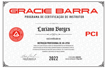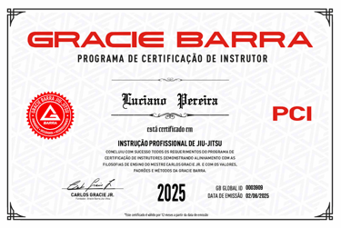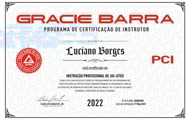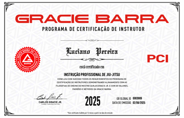 Since 2022, Luciano has also been a certified instructor through the Gracie Barra Instructor Certification Program (PCI), renewing his certification every year (2022, 2023, 2024, 2025). This credential, under the philosophy of Master Carlos Gracie Jr., demonstrates his alignment with Gracie Barraβs teaching methodology, values, and professional standards.